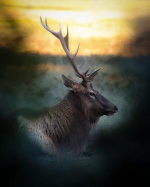 Majestic elk beds down for the evening as the sun begins to set over Redwoods National Park, California.